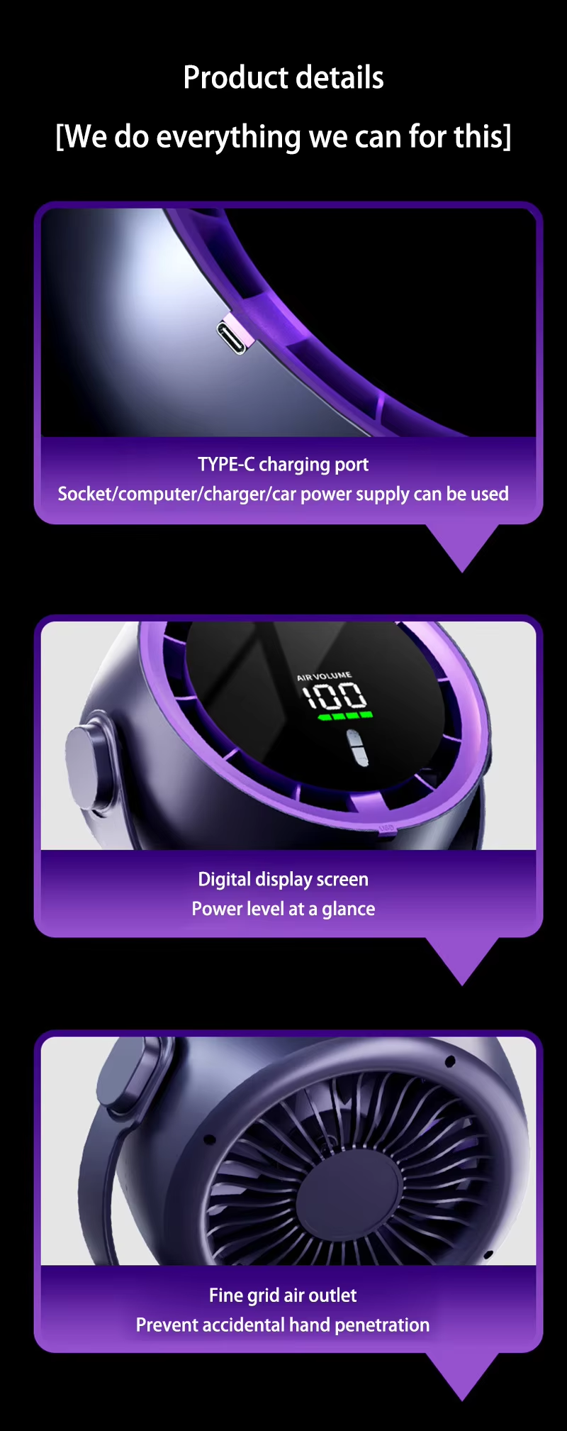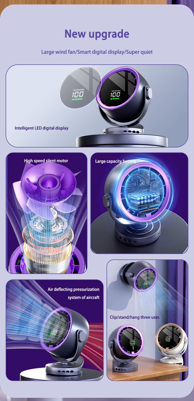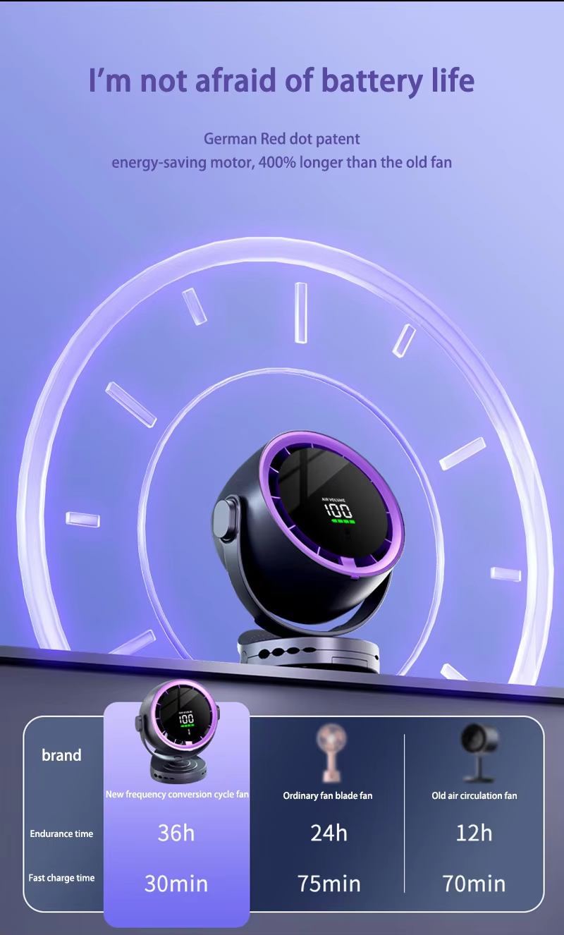【Smart LED Display】The LED screen of the battery fan clearly shows battery level and speed settings. It auto-dims after 5 seconds to avoid light disturbance, making it perfect for nighttime use.