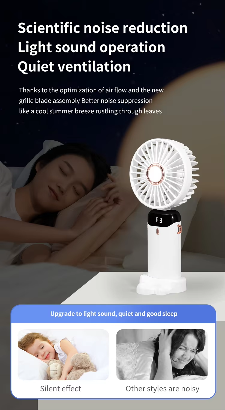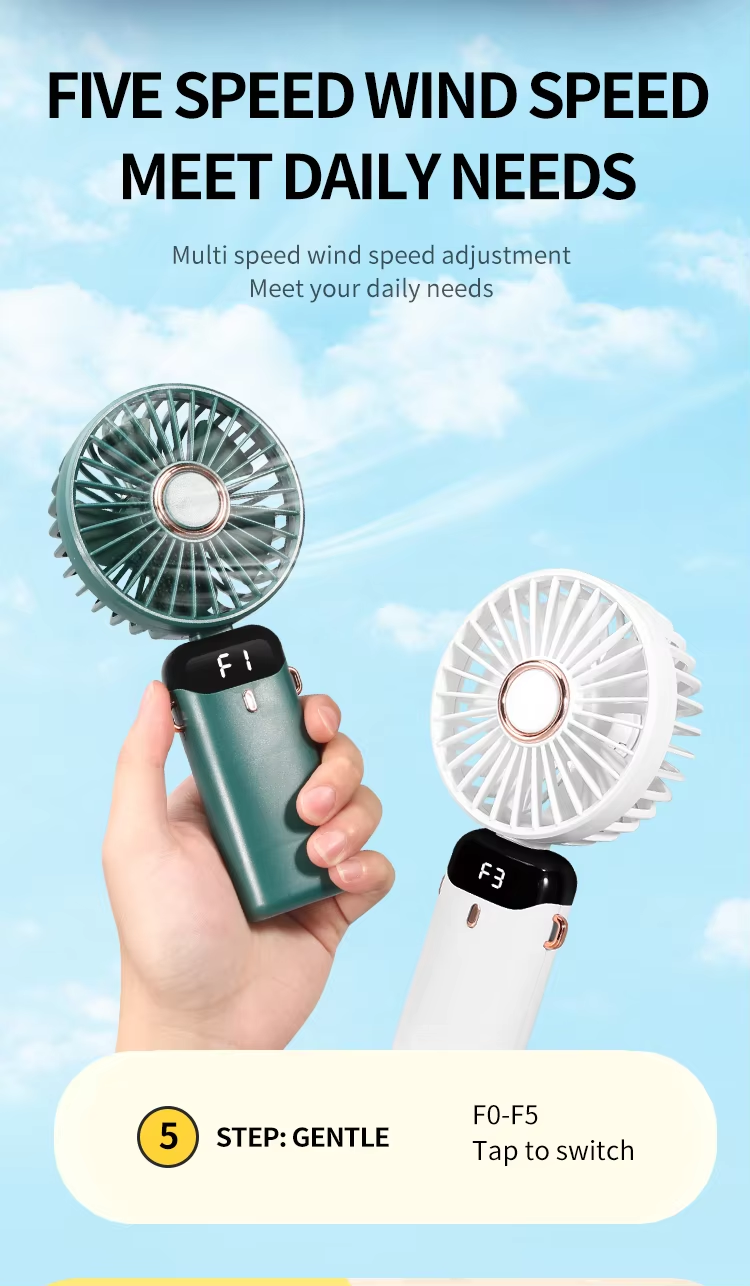 【Intelligent display】The mini handheld fan is equipped with a smart digital display screen, which can display the current gear. You can check the remaining power at any time for timely charging. The user-friendly design makes it more convenient for you to use and understand the working state of the mini fan more intuitively, so as to meet your personal cooling needs.