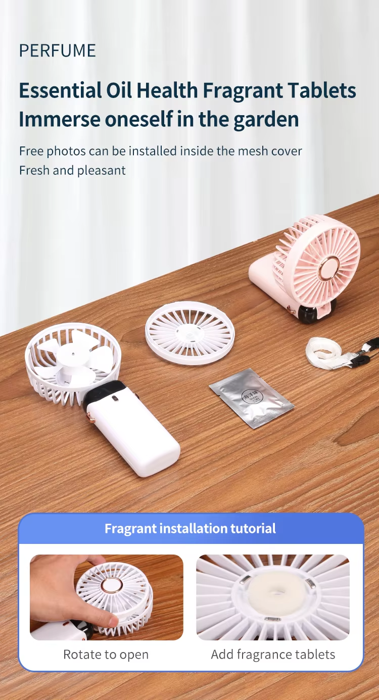 Packing list: fan, Base, manual, Charging cable, Aromatherapy tablets, Lanyard.