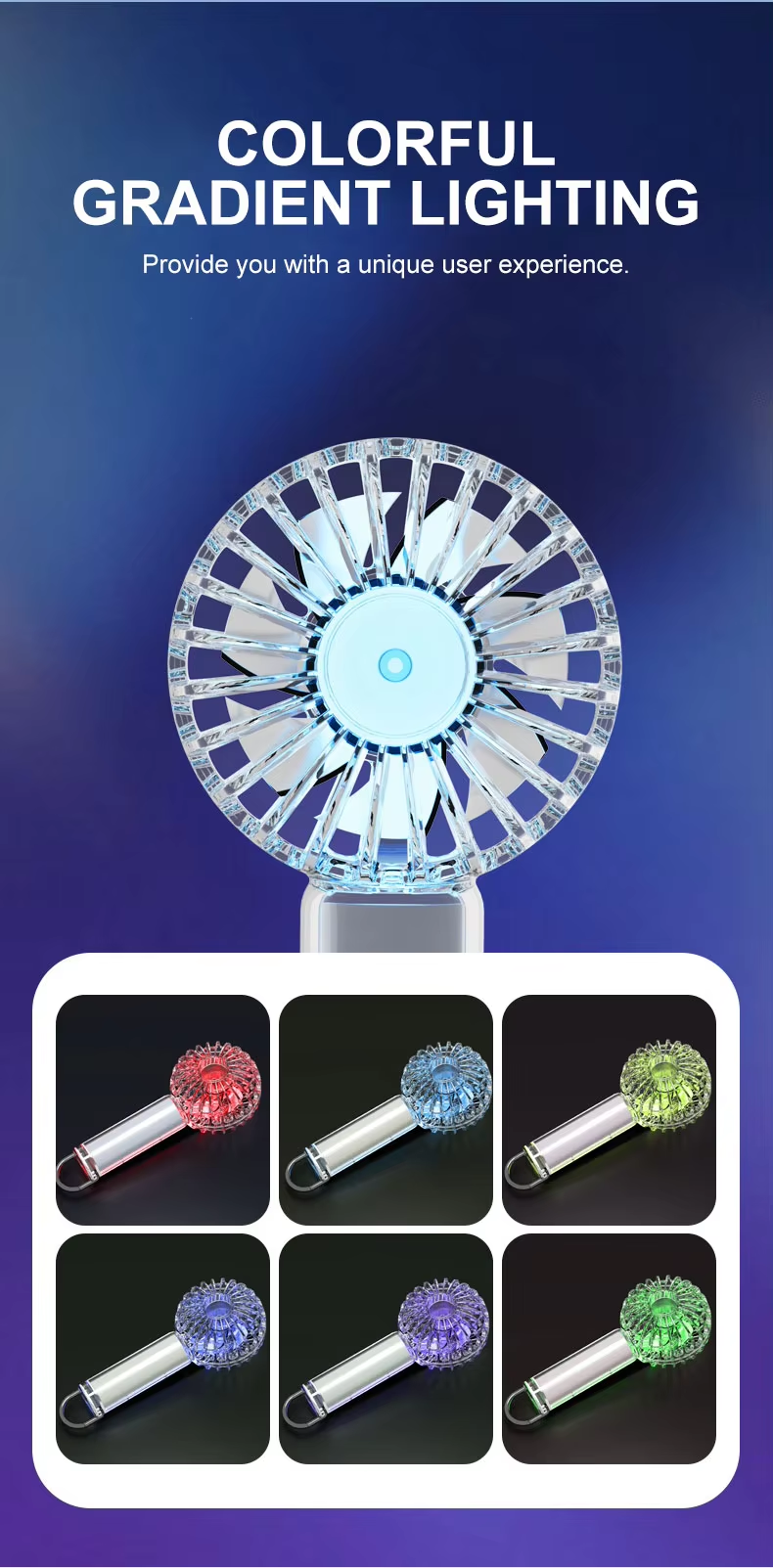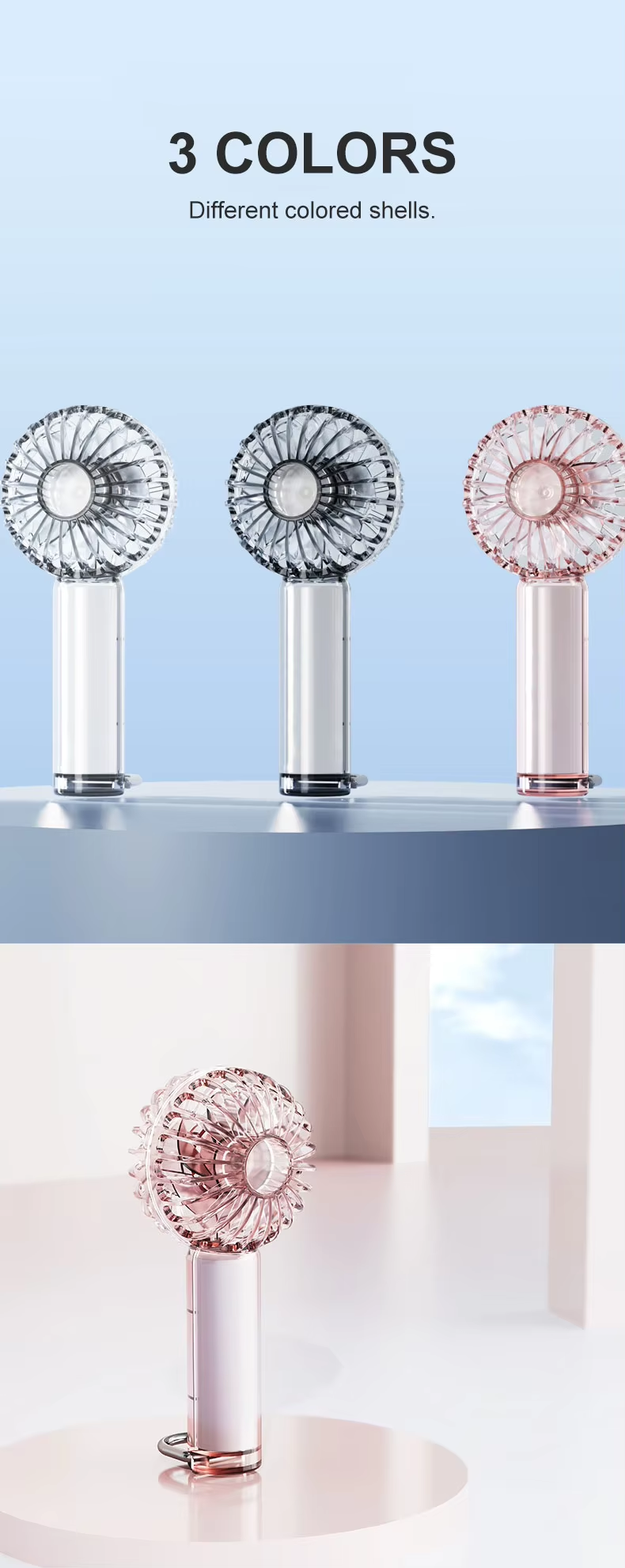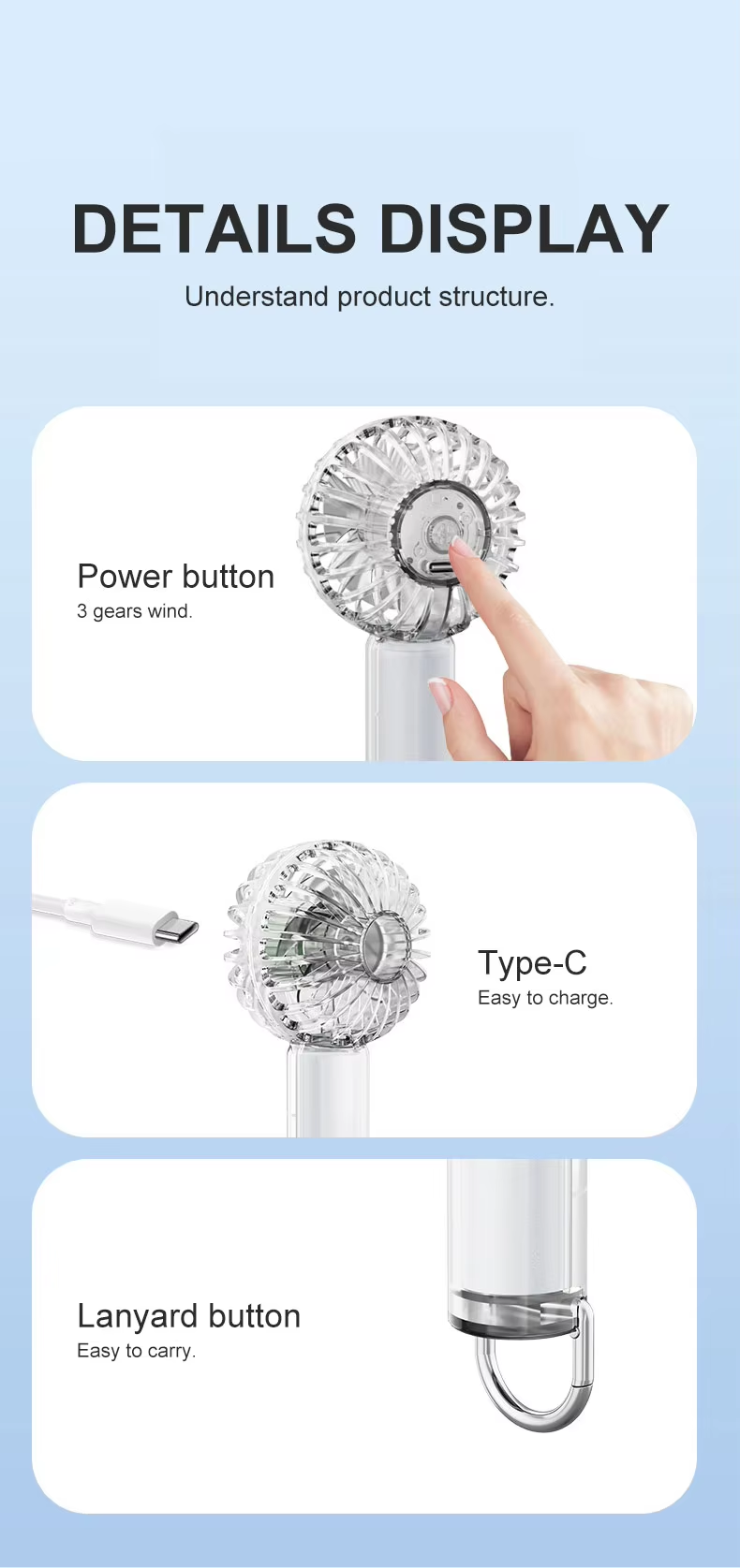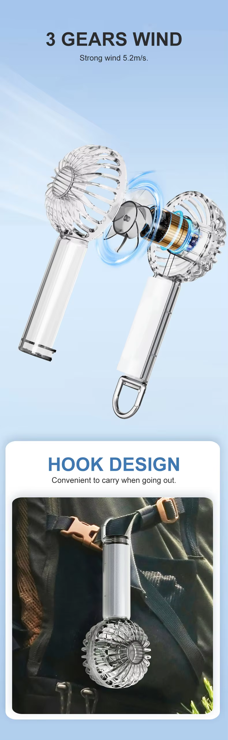 【3-Speed & Powerful wind】This portable fan has built-in copper brushed motor, which are powerful enough to generate strong wind. You just need to press the power button to change the 3 wind setting of the hand fan.