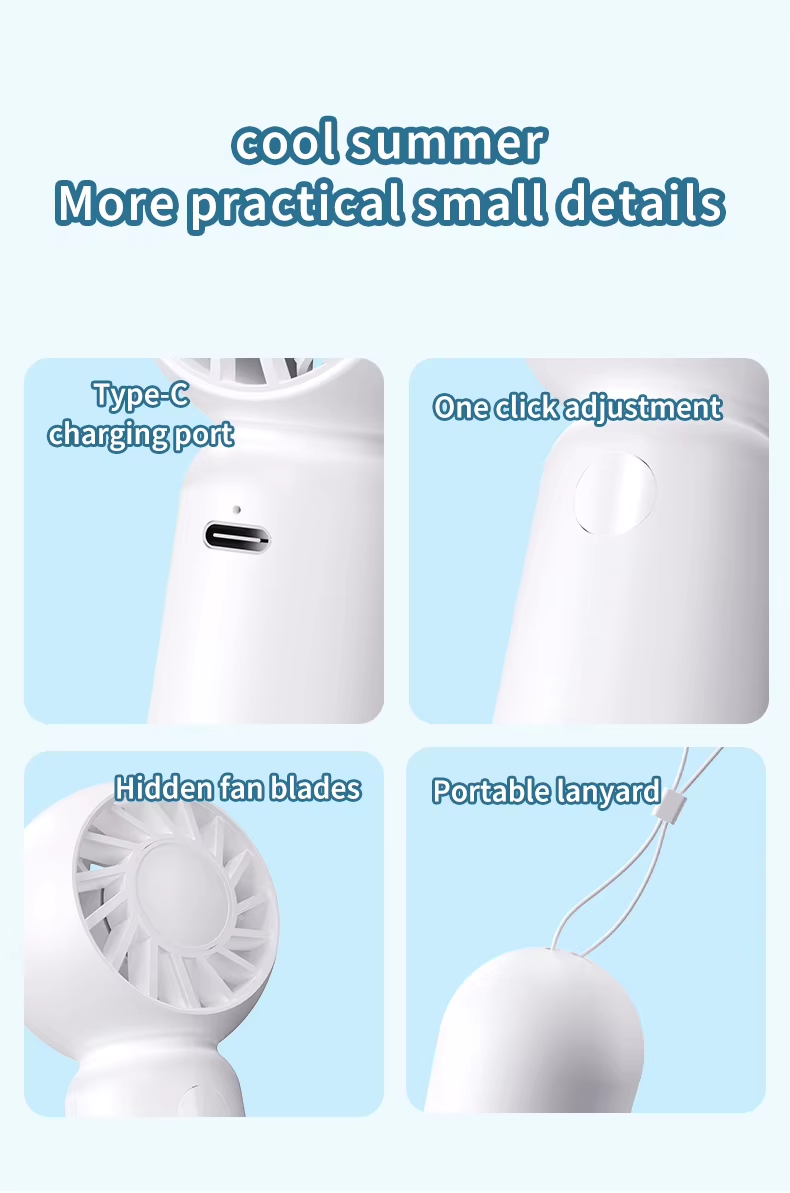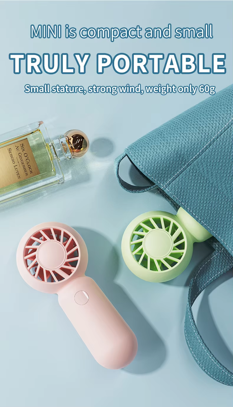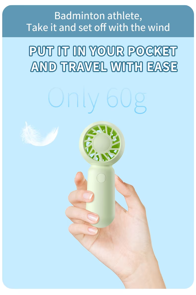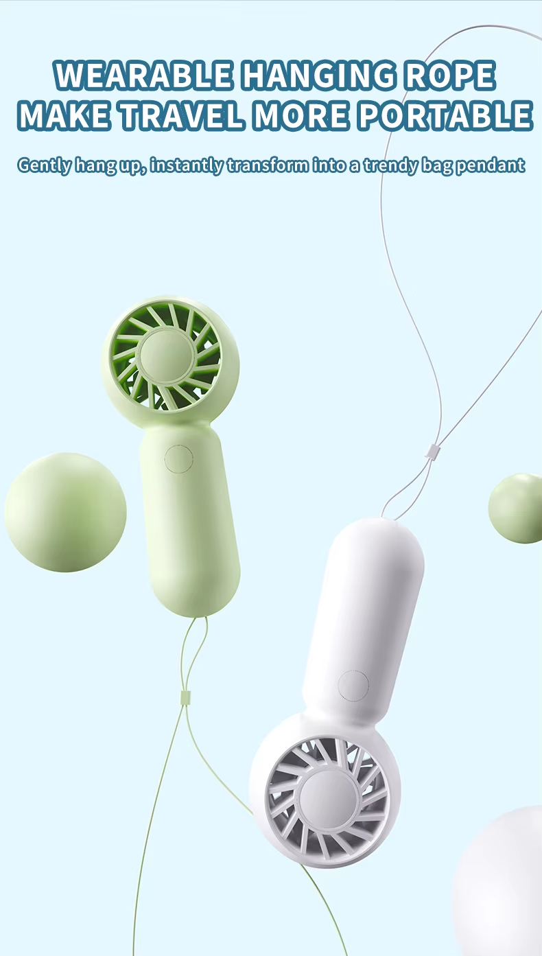【Small size】: This cute little fan is only 12*5.3*3.9CM/4.72*2.09*1.54 inch, 118 g/0.18 lb, you can put it in your pocket or bag and hang it around your backpack.